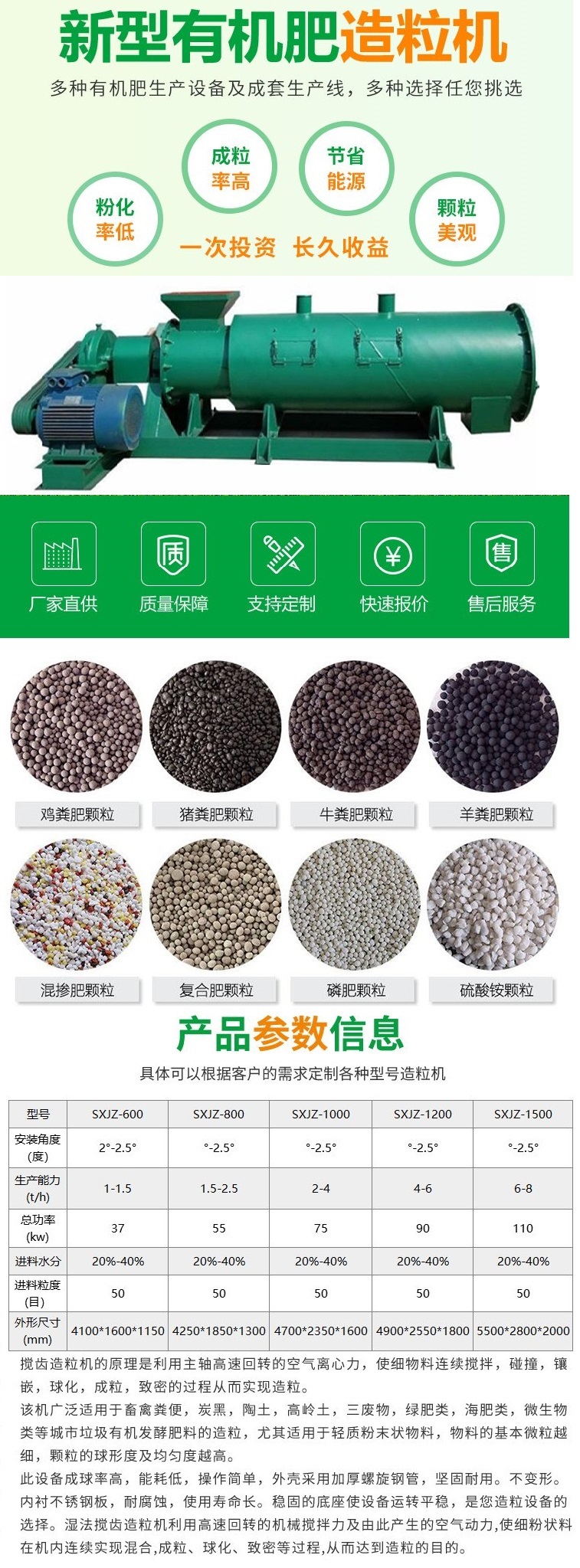 新型有機(jī)肥造粒機(jī)可以對有機(jī)肥料畜禽糞便、堆漚肥料類、綠肥類,海肥類,餅肥類,草炭類,土雜肥,微生物類等城市生活廢棄物有機(jī)發(fā)酵肥料造粒的專用性,顆粒為不規(guī)則球型。