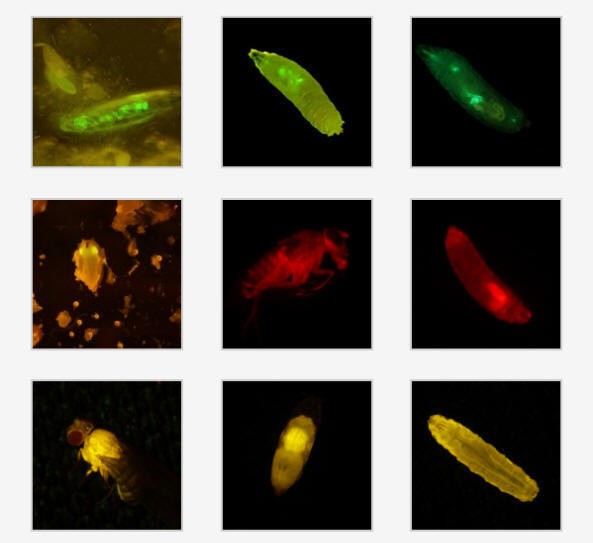 果蠅幼蟲和成蟲在體視顯微鏡下發(fā)出的熒光