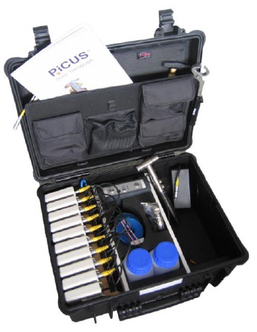 說明書、手提箱、測量卷尺、固定用綁帶、安裝榔頭、測量用榔頭、Y形電纜、鉗子、一盒釘子(有不同長度)、電池、12個PICUS模塊、PICUS電源、PICUS電池充電線、RS232電纜、PICUS數(shù)據(jù)線、標準軟件。