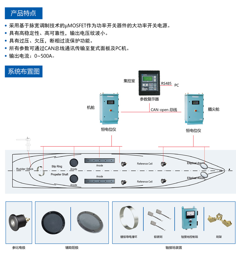 • Product description: 外加電流陰極保護(hù)裝置是為了使浸沒于水中的外部船體免受腐蝕而設(shè)計(jì)的。本套裝置經(jīng)過精心設(shè)計(jì)、合適 的安裝,能夠有效地消除海水對船體、舵和螺旋槳(推進(jìn)器)的腐蝕。外加電流陰極保護(hù)裝置可以大量減少犧 牲陽極的數(shù)量,降低維護(hù)成本和塢修工作量。