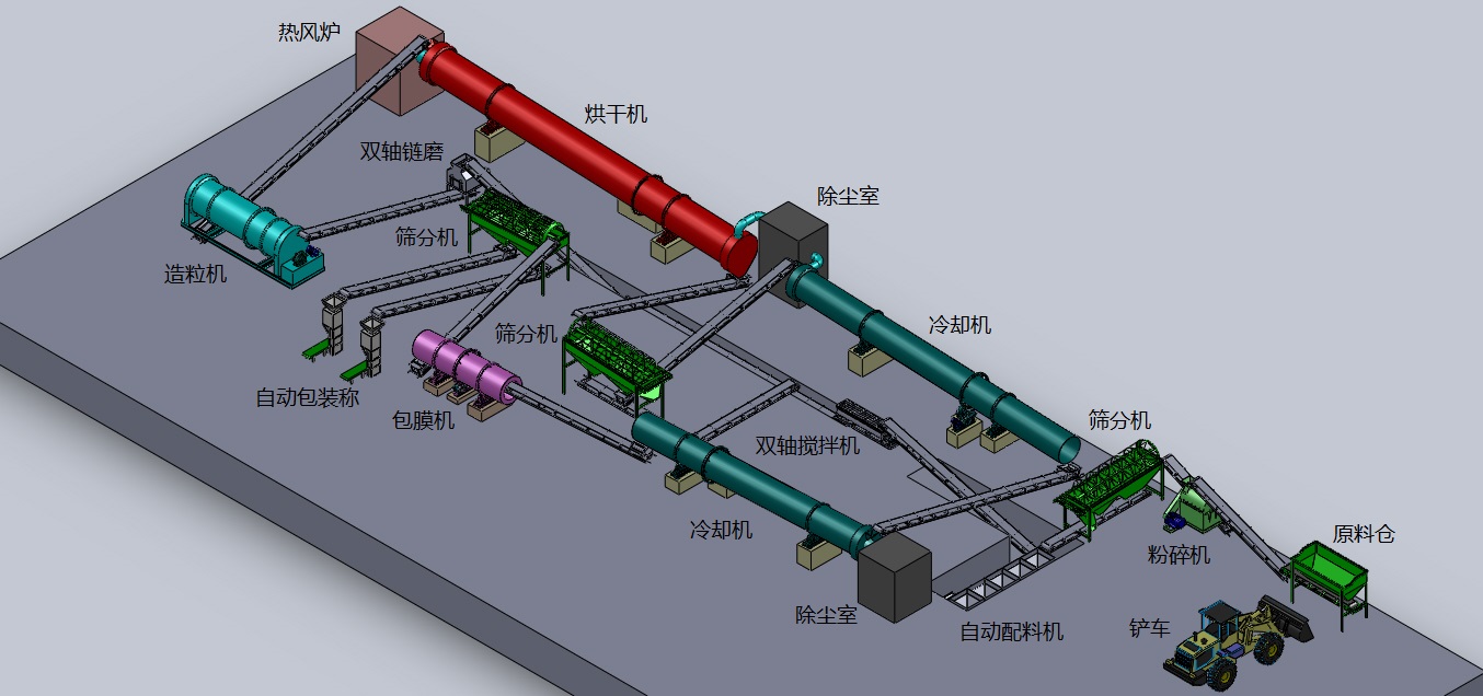 中配置:半濕物料粉碎機、臥式攪拌機、造粒機、烘干機、冷卻機、滾筒篩分機、包裝設備、皮帶輸送機等。